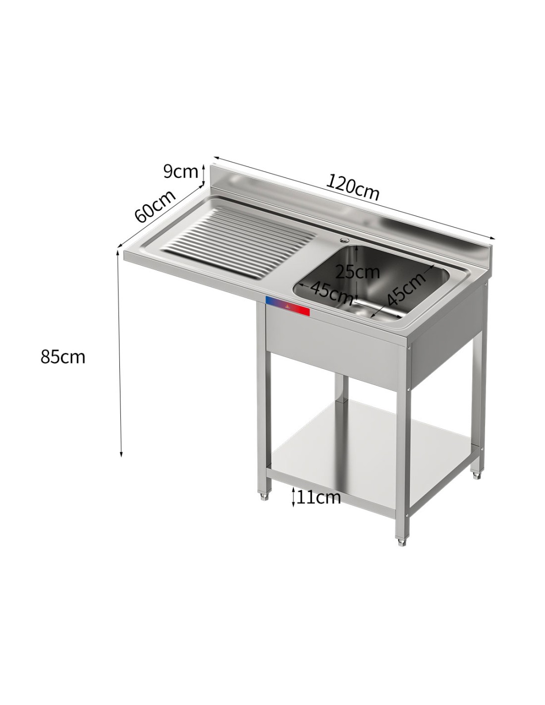 Fregadero bajo barra 1 seno y 1 escurridor, incluye grifo dos aguas industrial acero inoxidable 1200 x 600 x 850 mm