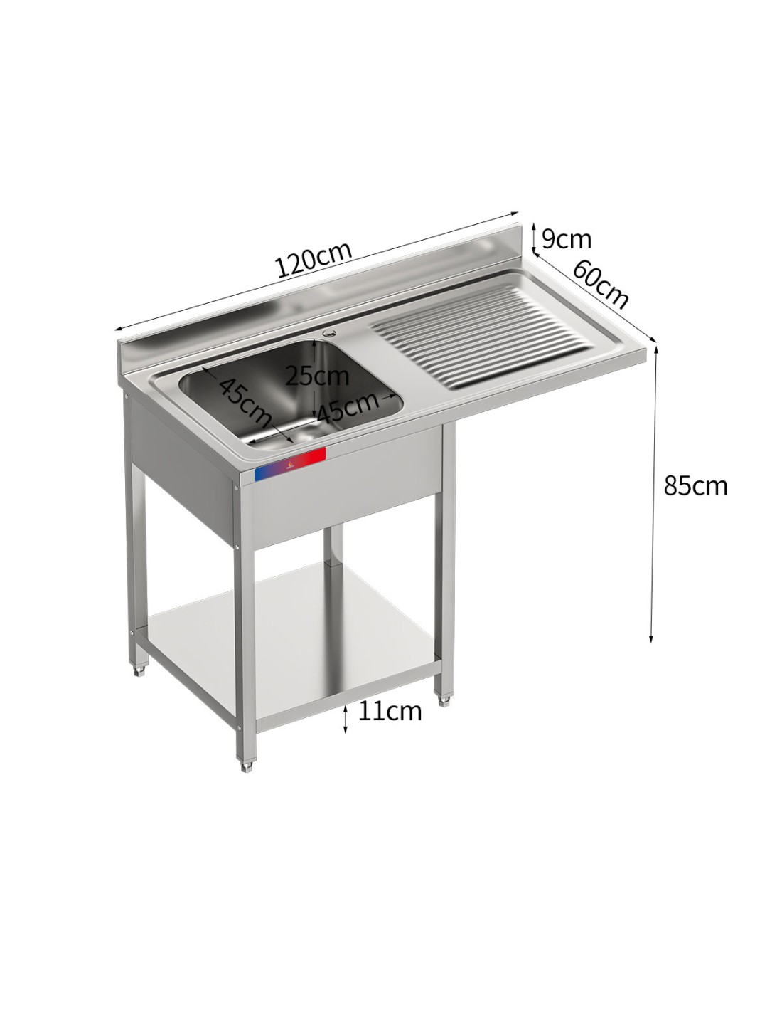 Fregadero bajo barra 1 seno y 1 escurridor industrial acero inoxidable hueco lavavasos 1200 x 600 x 850 mm