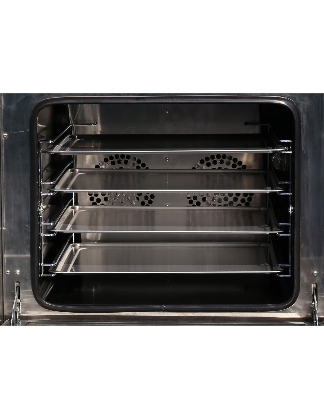 Potente y versátil horno de convección Gasfrit. La serie Gasfrit es una tecnología de cocina inteligente para asar, freír y hornear, y le ofrece toda una gama de potentes hornos de aire caliente. Este horno dispone de un espacio para cuatro bandejas de 438 x 315 mm (incluidas) e una puerta de vidrio doble con bisagras. El exterior está fabricado de acero inoxidable y el interior de acero esmaltado, que garantizan una durabilidad y resistencia muy buena. Destinado a un uso profesional en la hostelería y cocinas de negocios hosteleros. Ya sea que esté cocinando patatas, carne o pasteles, el potente y moderno horno de convección lo hace más rápido y mejor que los tradicionales hornos estáticos. Gracias al sistema de ventiladores, que distribuye el calor uniformemente en el horno, los resultados se mantienen estables. Con termostato variable de 50°C a 300°C .