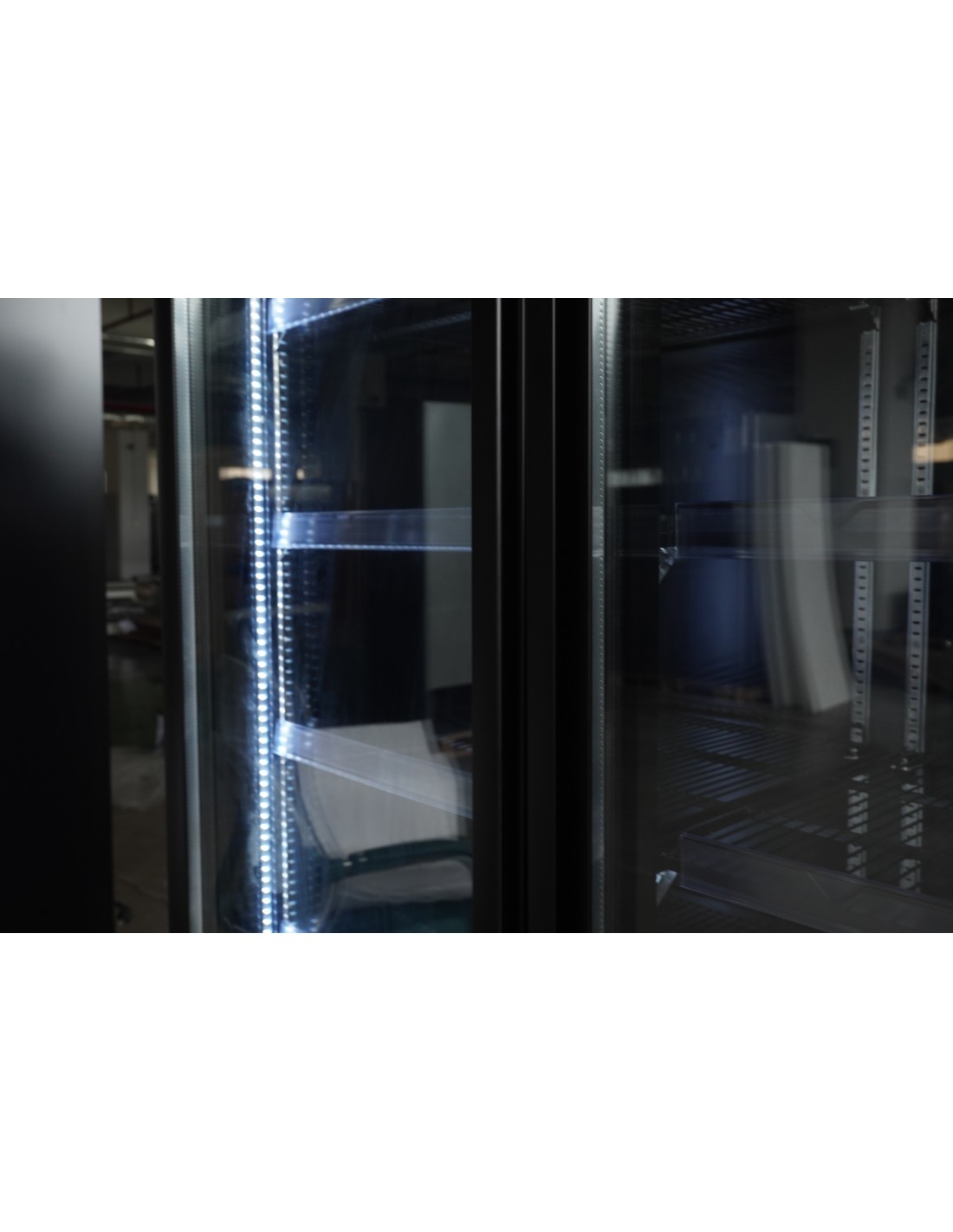 Su sistema de refrigeración totalmente ventilada garantiza una temperatura uniforme, mientras que el control digital Carel permite un ajuste preciso y fiable. Las puertas de doble cristal templado con iluminación interior LED multicolor aportan un toque moderno y atractivo, ideal para resaltar bebidas, postres o productos gourmet.