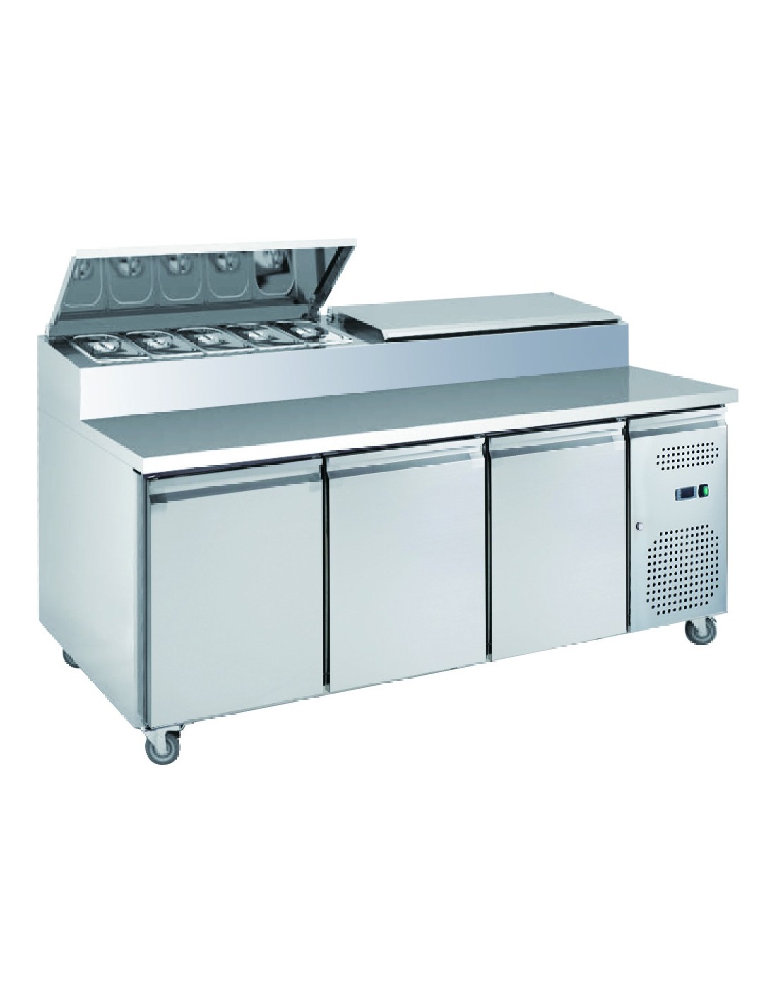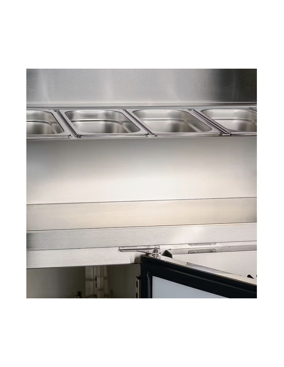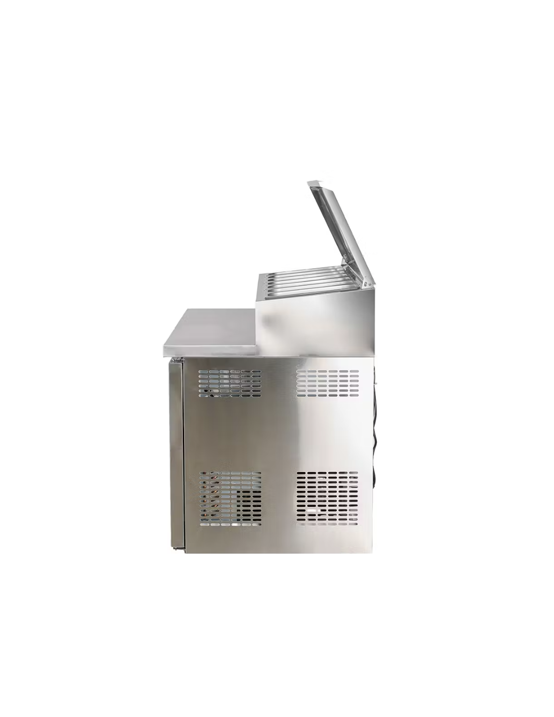 Mesa refrigerada de preparación ideal para ensaladas, pizzas y platos fríos, diseñada para conservar los ingredientes frescos y siempre listos para su uso en cocinas profesionales.