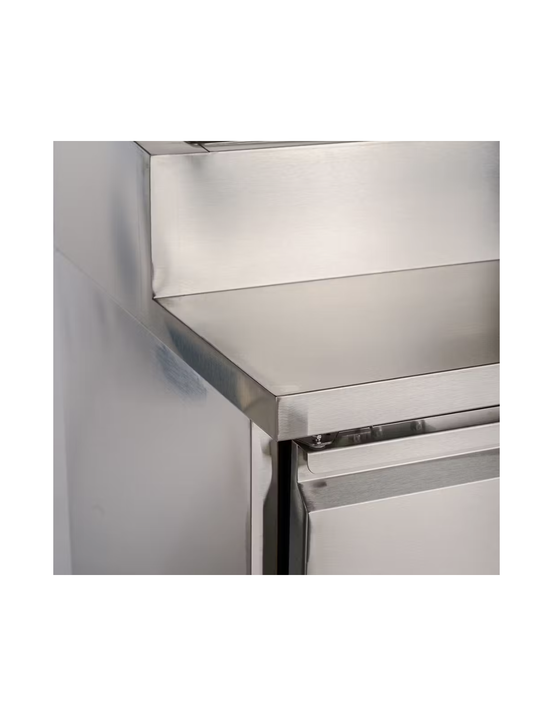 - Mesa Ensaladera Refrigerada de Preparación de 2 puertas abatibles fabricado en acero inoxidable con 390 litros de capacidad.