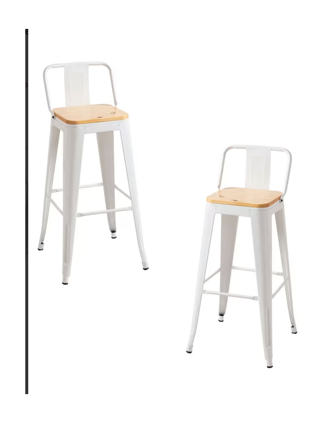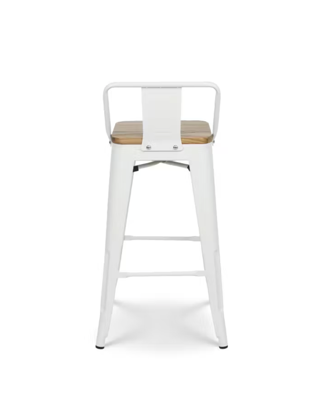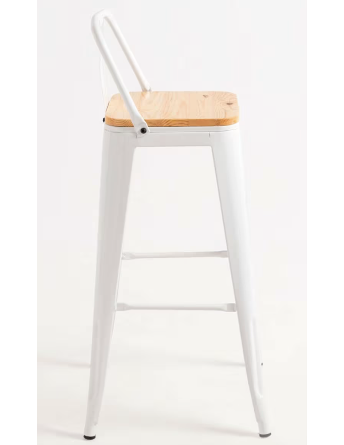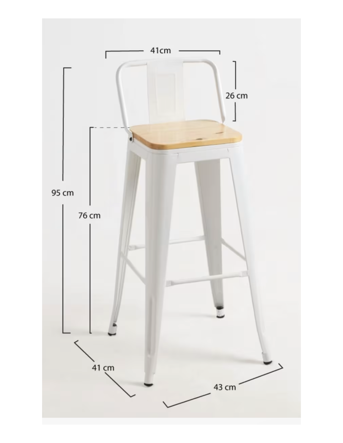 taburete de bar de metal blanco mate con asiento de madera y respaldo. 400 x 400 x 930 mm pack 2 unidades