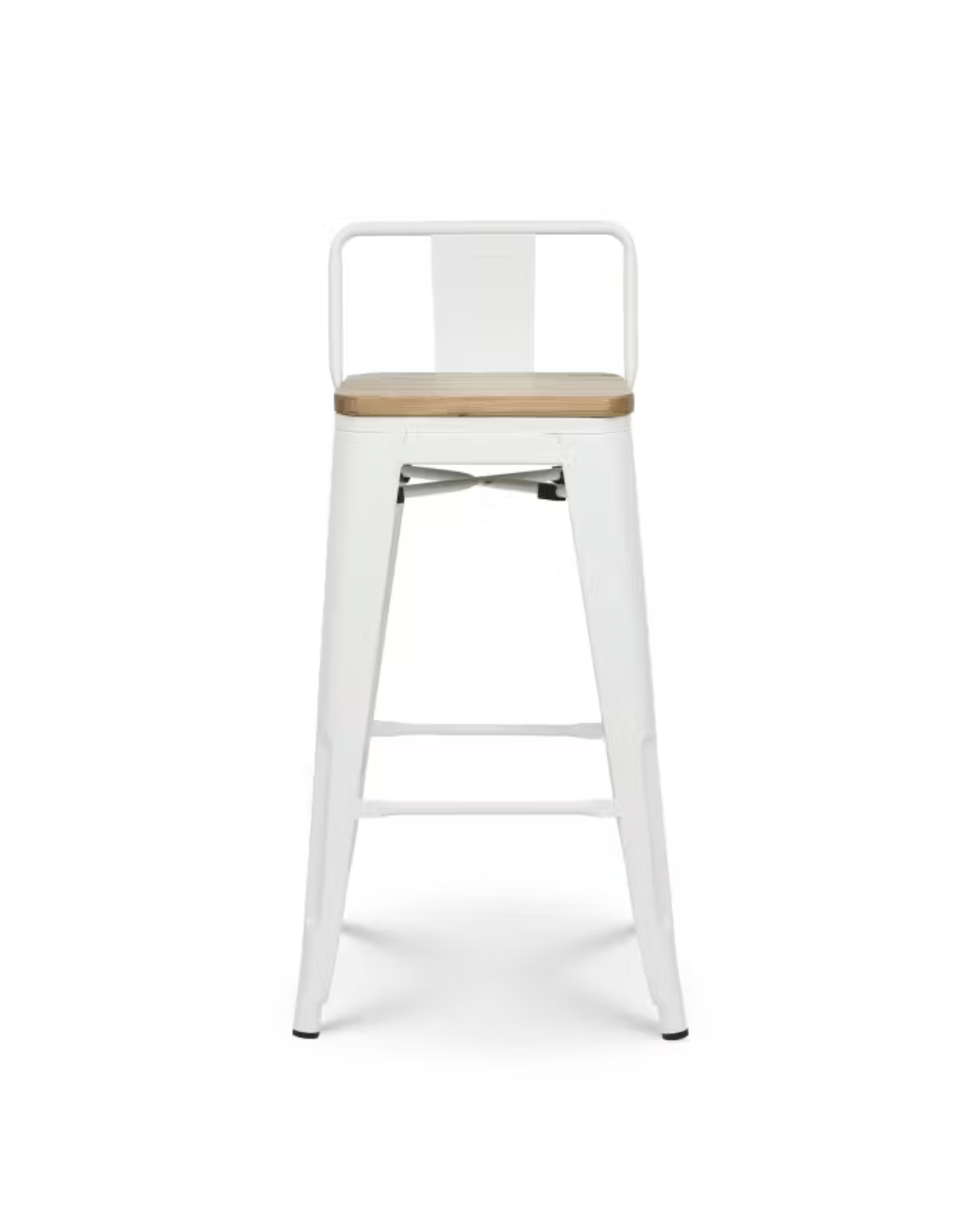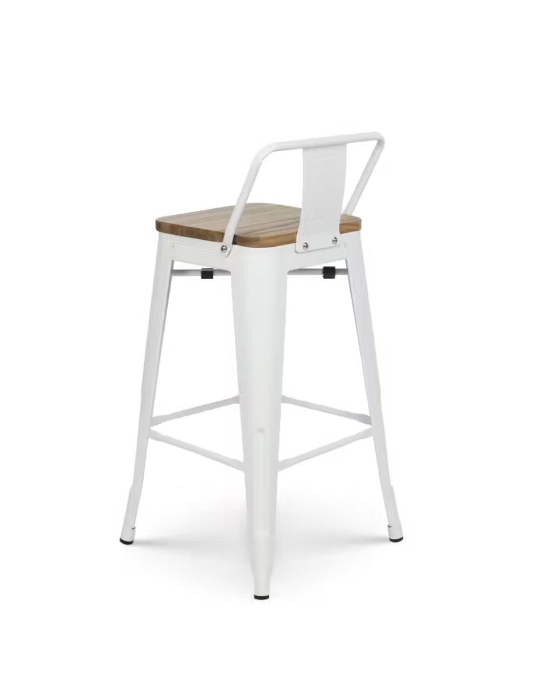 taburete de bar de metal blanco mate con asiento de madera y respaldo. 400 x 400 x 930 mm pack 4 unidades